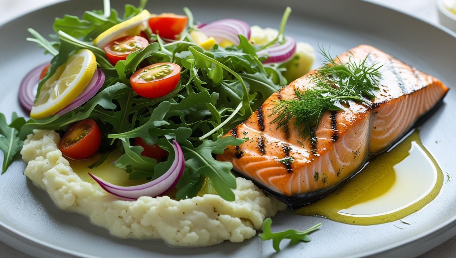 High Protein, Low Calorie Feast: Grilled Salmon, Arugula Salad, and Cauliflower Mash
